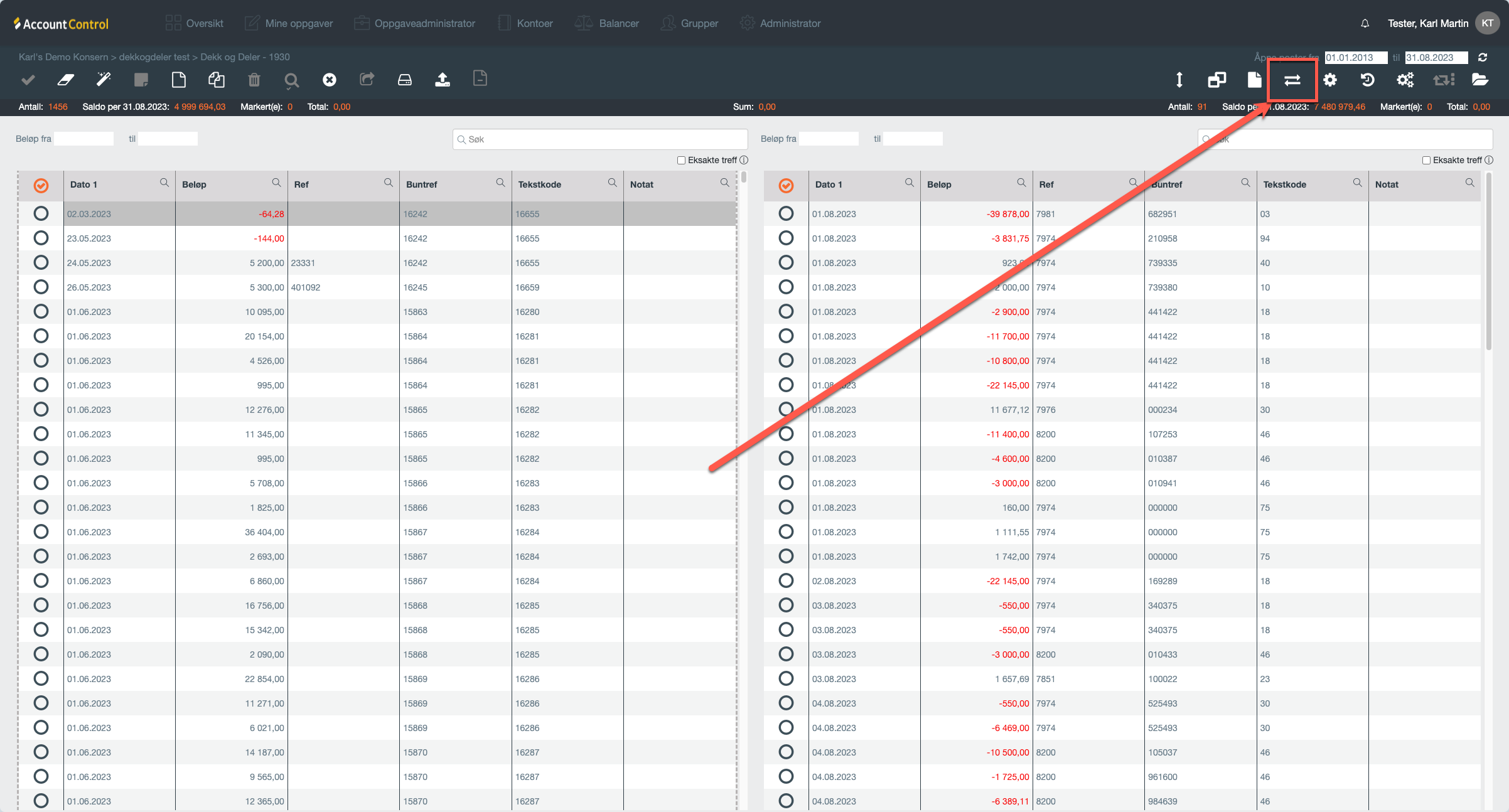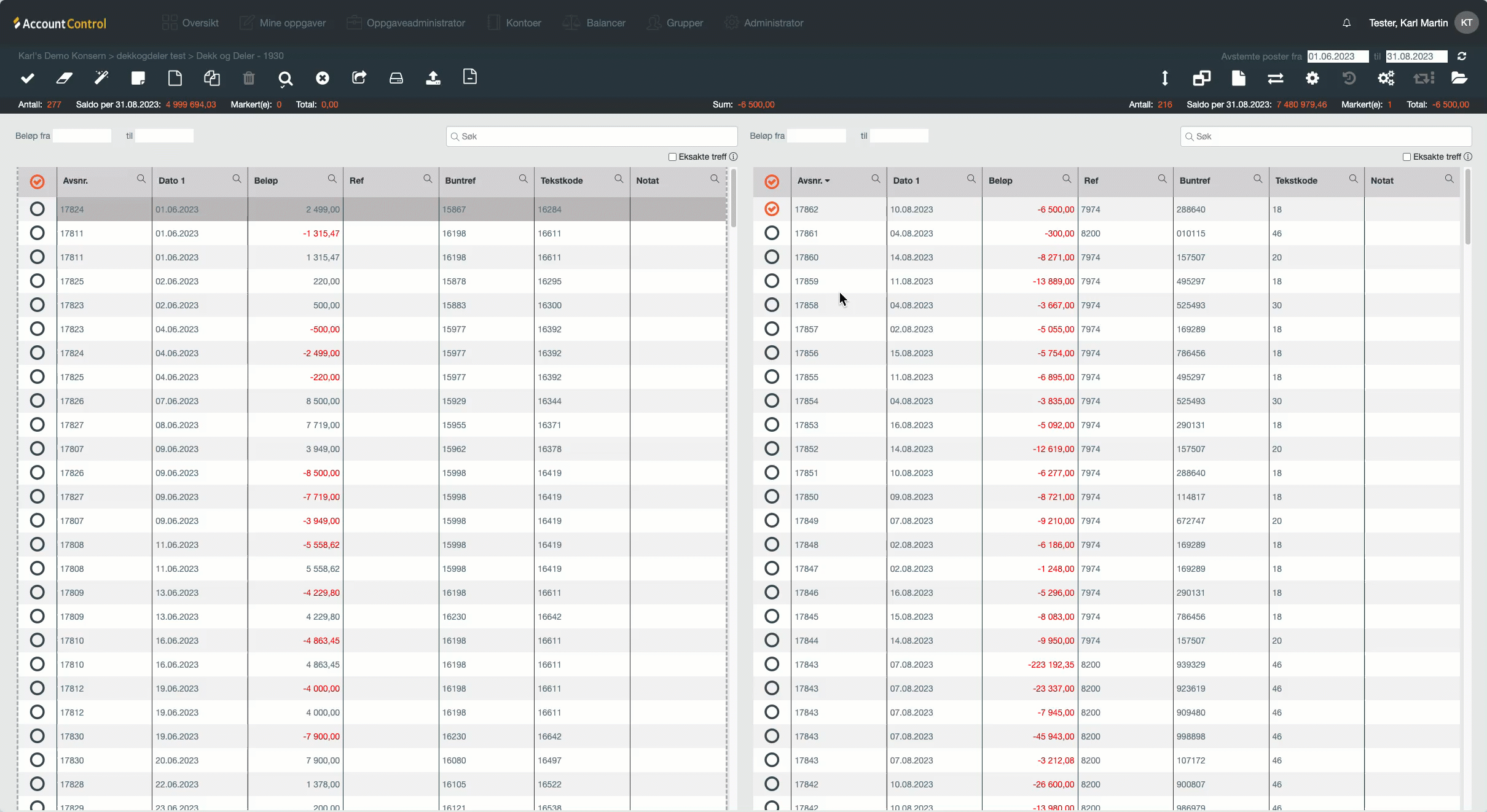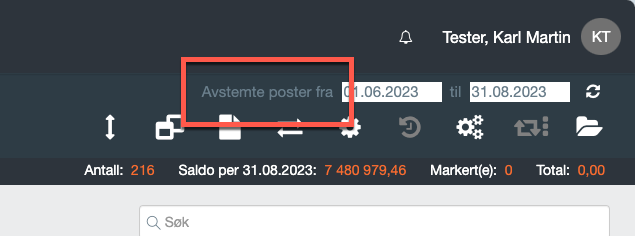 Ved å klikke på avstemmingsnummeret vil man få opp informasjon om hvem som avstemte posten og når avstemmingen ble gjennomført.