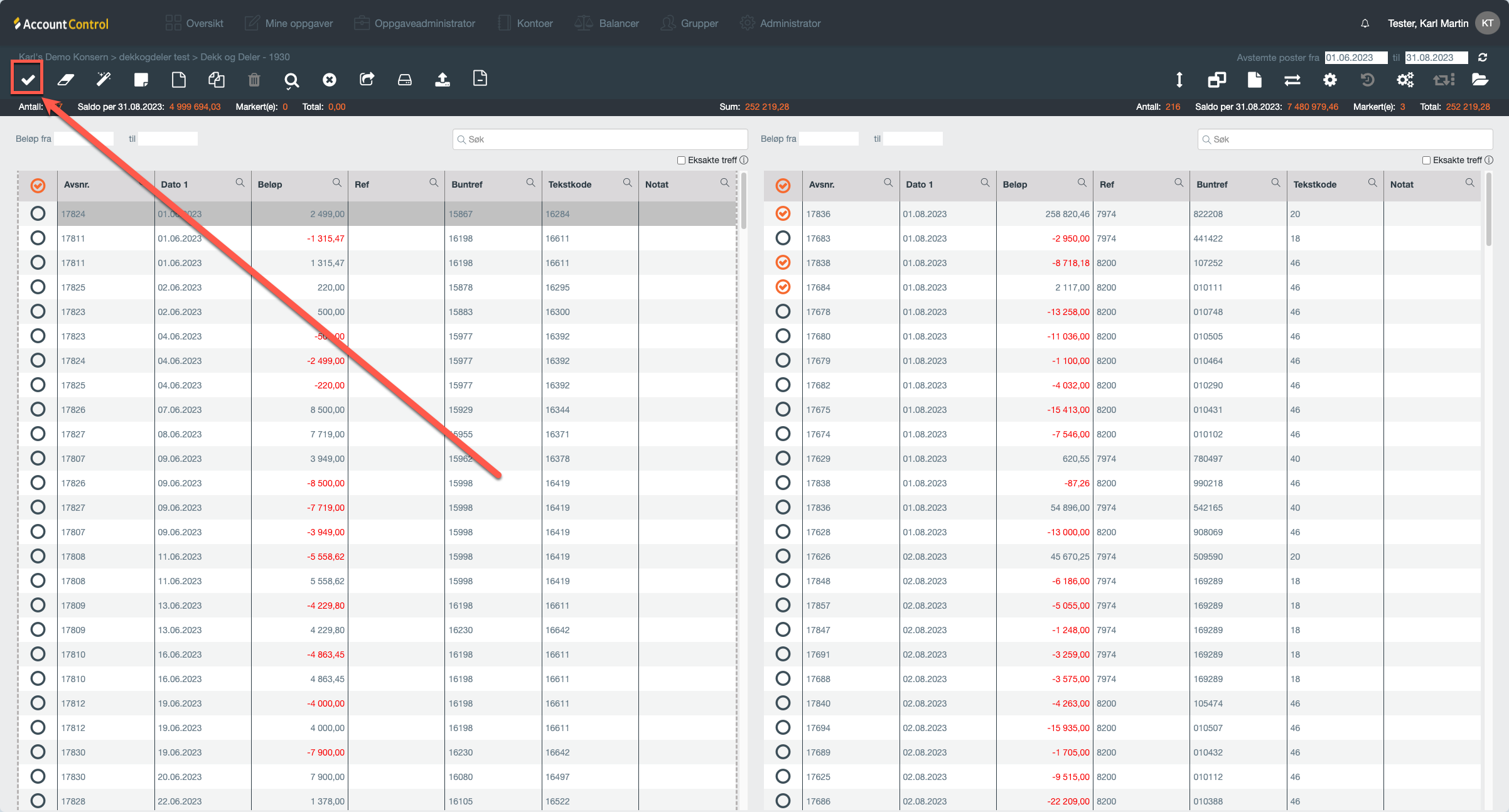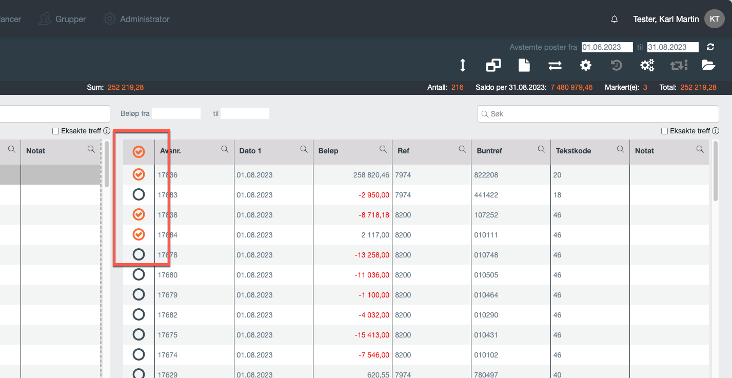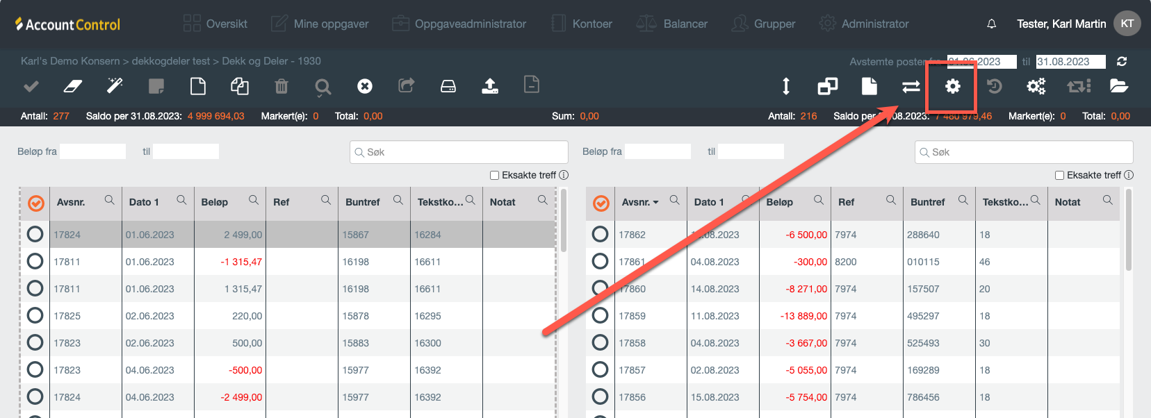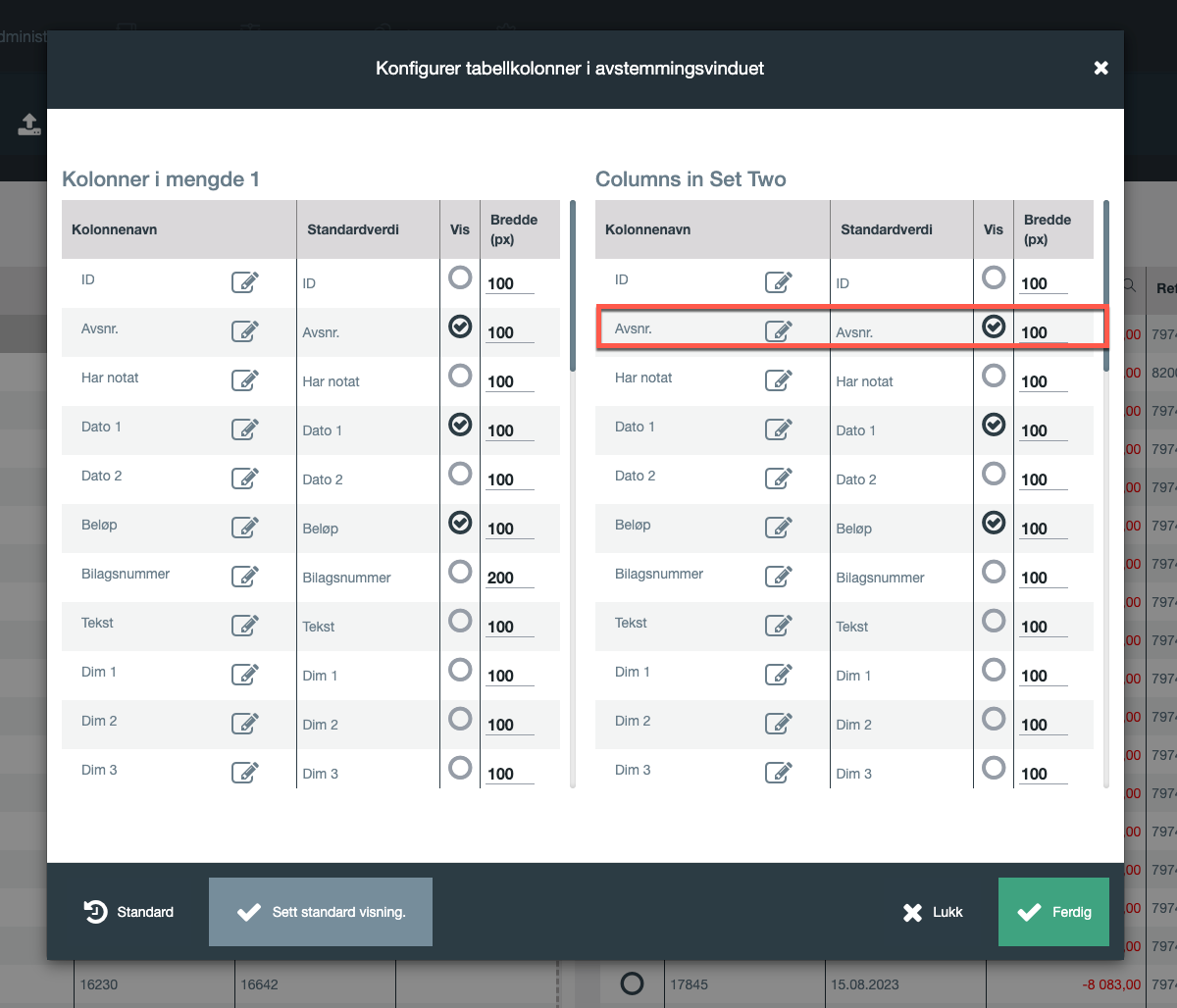 Hvis man ikke ser avstemmingsnummer kan dette aktiveres ved å trykke på kolonneinstillinger og aktivere avsnr: