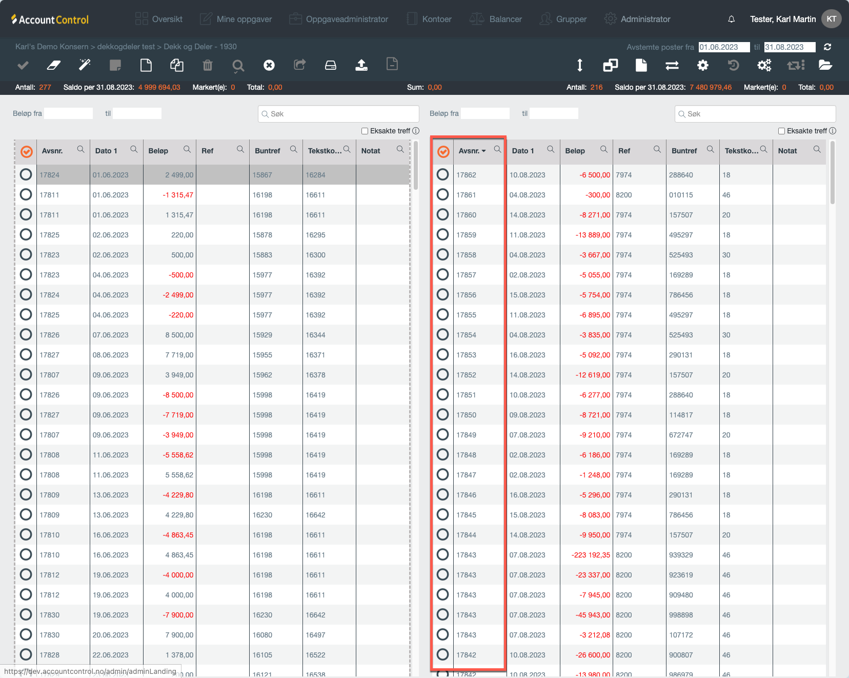 Ved å organisere etter avstemmingsnummer, kan man identifisere poster som nylig er avstemt. Jo nyere en avstemming er, desto høyere vil "avsnr" være. I eksemplet nedenfor vil posten med avsnr. 17862 være den senest avstemte posten.