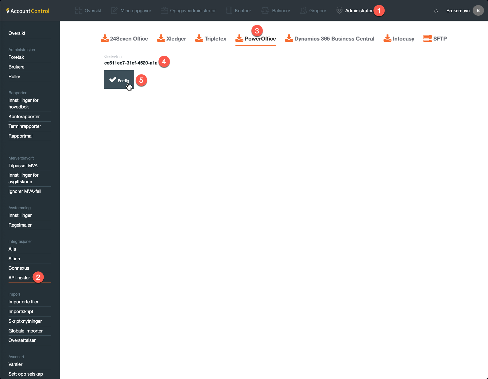 Logg inn på app.accountcontrol.no og naviger til Administrator. Klikk deretter på API-nøkler, og deretter PowerOffice i toppmenyen. Alternativt kan du trykke på denne linken: API-nøkler. Lim inn klientnøkkel i anvist felt og trykk på Ferdig