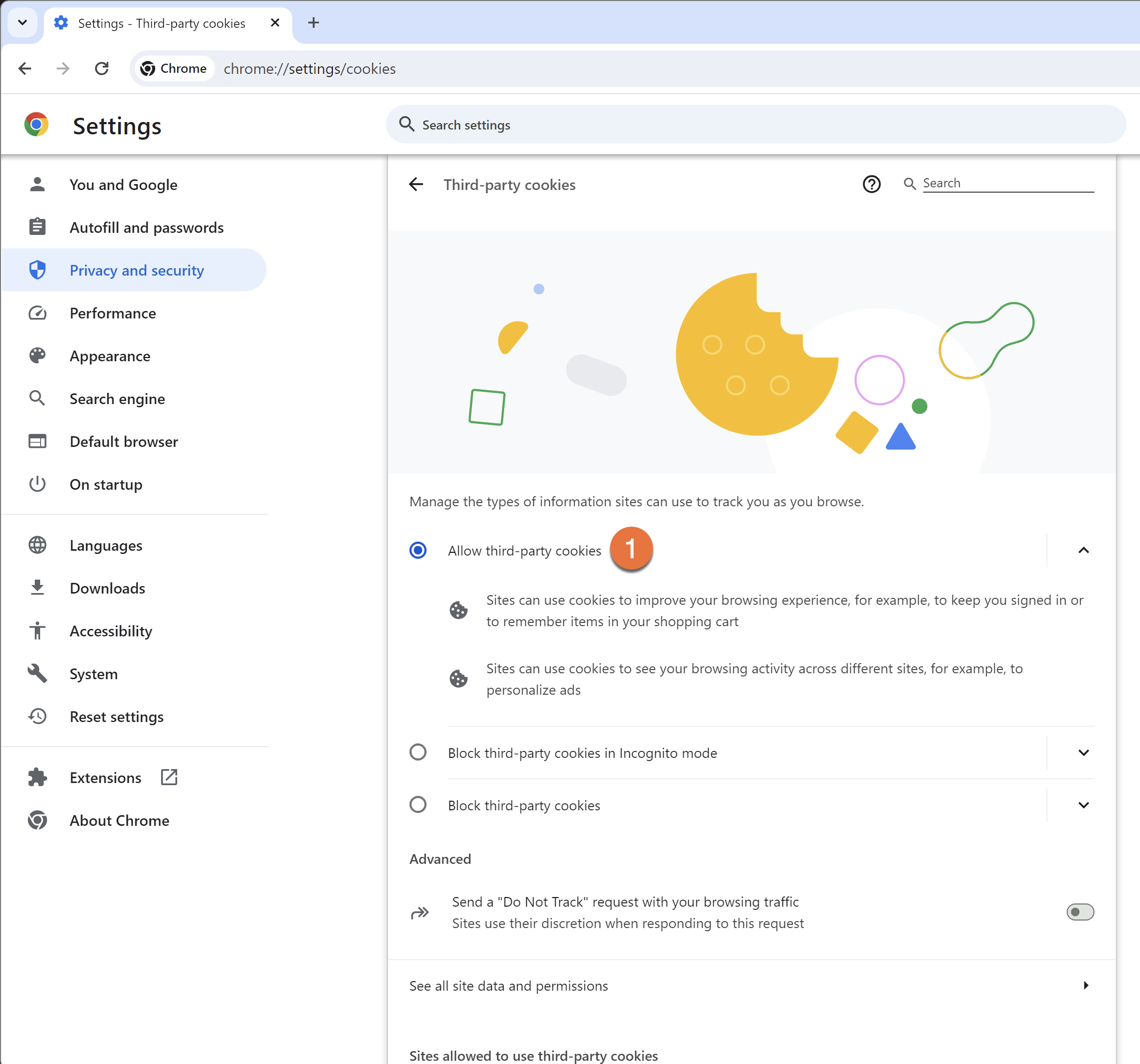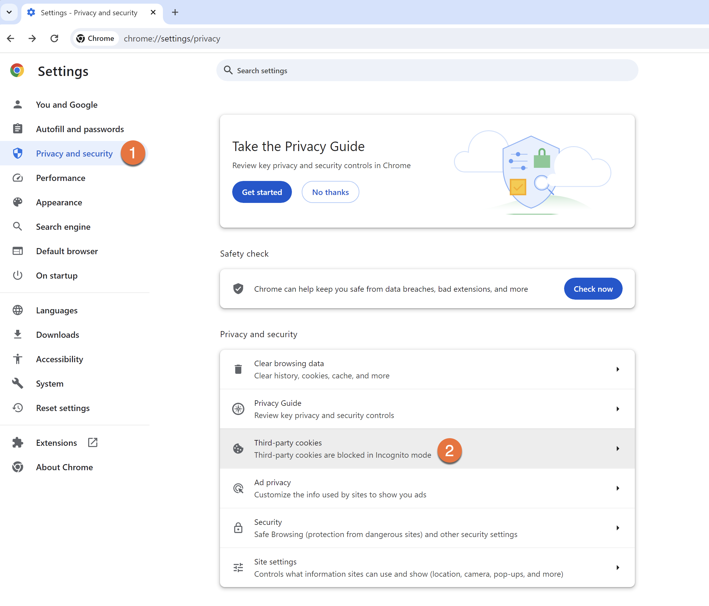 Klikk deretter på Personvern og sikkerhet / Privacy and security -> Tredjeparts-cookies/ Third-party cookies som anvist i bildet under.