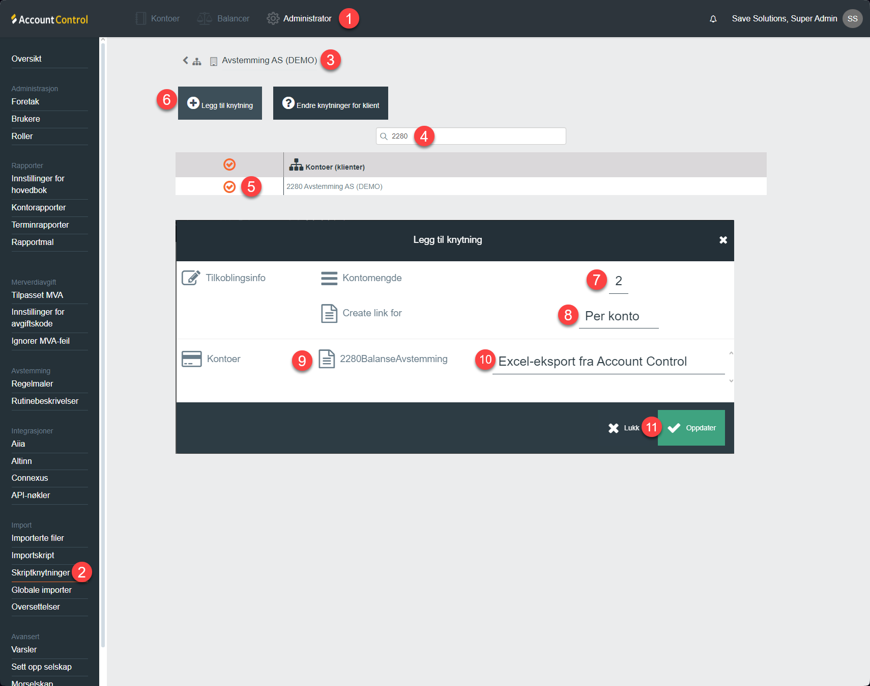 - Naviger til Administrator → Skriptknytninger og velg selskapet du akkurat laget kontoen på.