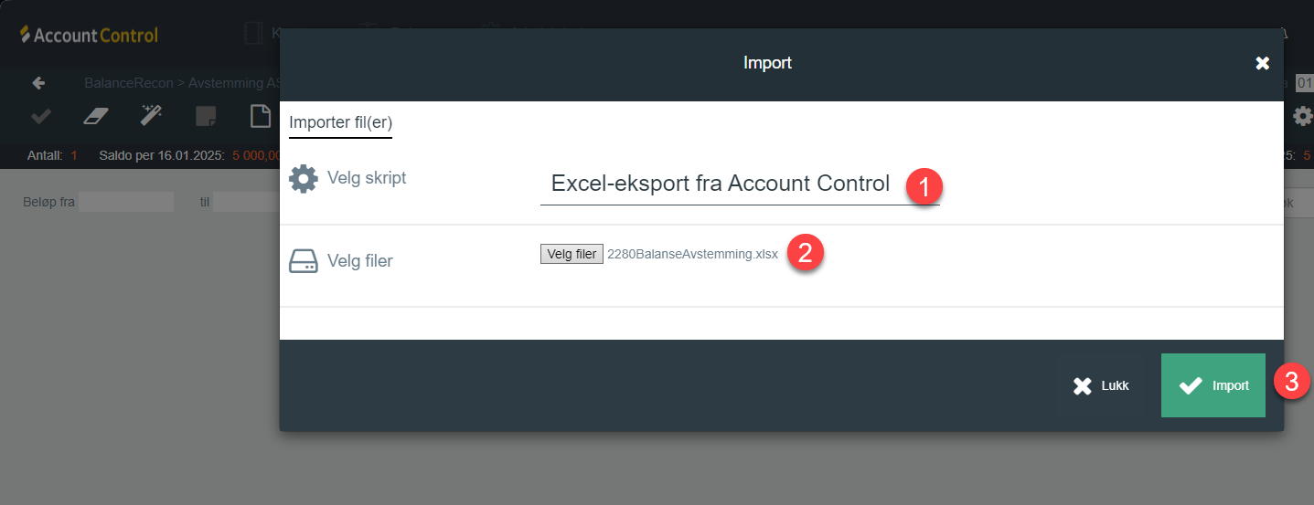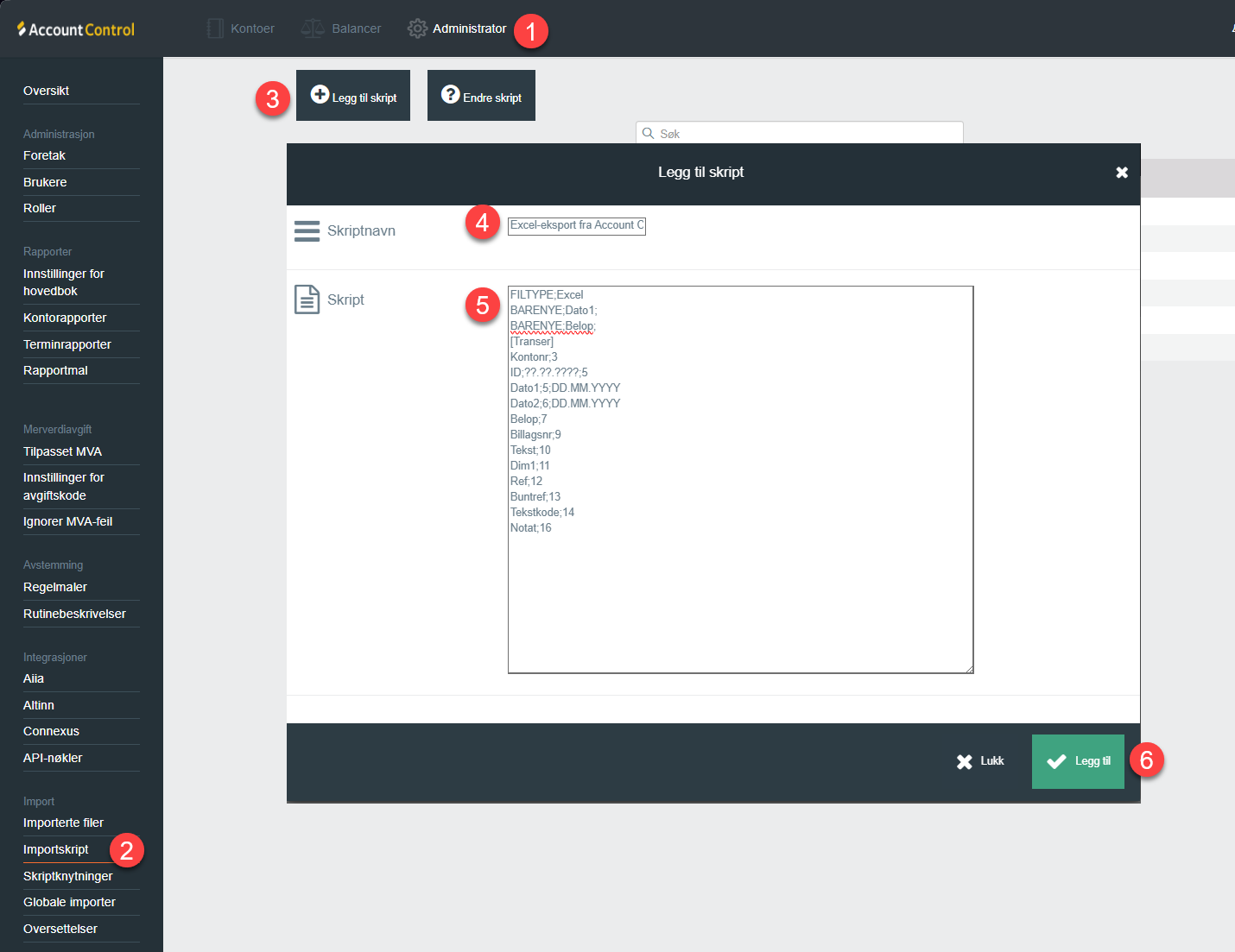 - Om postene er hentet fra en annen konto i Account Control via funksjon for Excel-eksport, kan du benytte importskriptet Excel-eksport fra Account Control) i felt (4), og lime inn teksten under i felt 5: