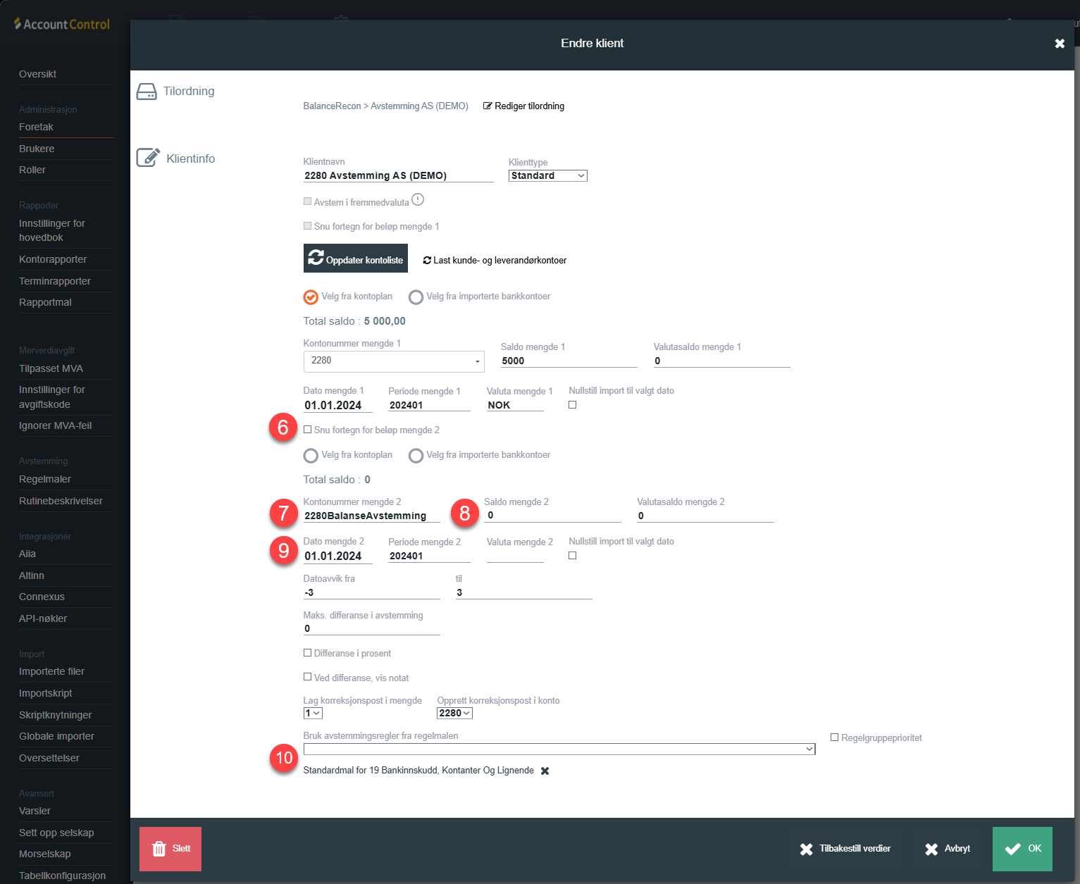 - Fyll inn kontonummer mengde 2 (7) med en navnekonvensjon som gir mening for dere. Her har vi navngitt kontoen med kontonummer fra motkonto, ettersom det gjør at vi enkelt kan importere poster eksportert direkte fra motkonto i Account Control, da kontonummeret blir lagt i en egen kolonne ved eksport.