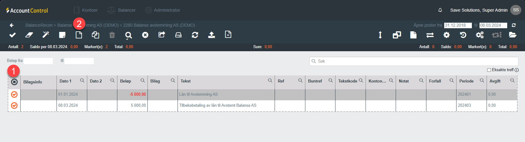 Her har vi valgt 0,- per 01.01.2024 ettersom vi i vårt eksempel ønsker å lese inn postene fra 2280 Balanse Avstemming AS som korresponderer til denne kontoen. De vil nulle ut åpningsposten vår, samt tilbakebetalingen av lånet til Avstemming AS, som skjer i den 08.03.24 i vårt eksempel.