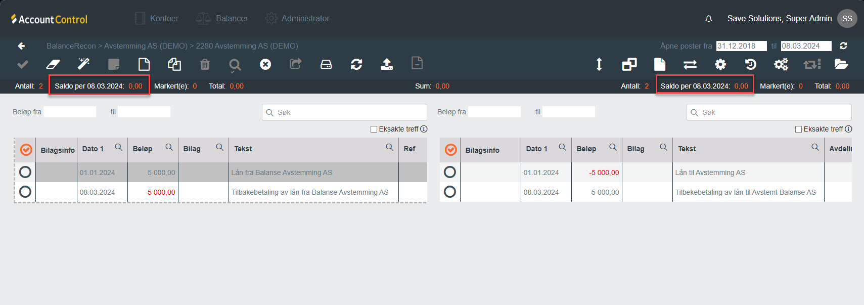 Slik ser transaksjonene og saldoene ut etter import, og de kan nå avstemmes som normalt. Legg merke til at saldoene går mot null når alle kredit- og debetposter finnes på begge sider i vårt eksempel. Denne kontoen er dedikert til lån mellom selskap i samme konsern, og alt som ligger på den ene kontoen skal ligge på dedikert mellomregningskonto på motsvarende selskap. Saldoene vil derfor være null når de ikke skylder hverandre noe.