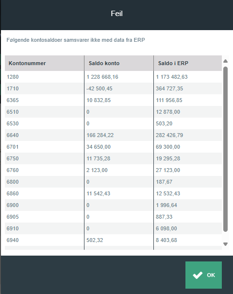 Dersom du mottar denne feilmeldingen ved lukking av en termin, betyr det at datagrunnlaget i Account Control må oppdateres. Dette skyldes at det ikke lenger samsvarer med regnskapssystemet.